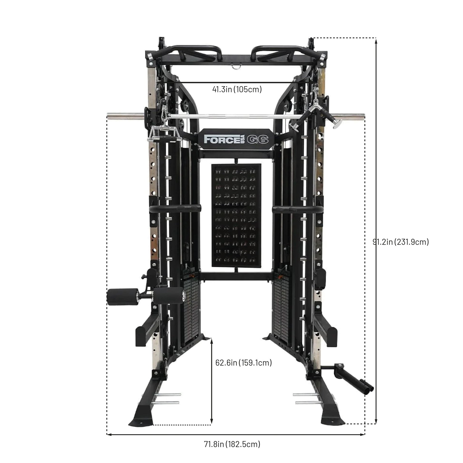 Take the next step in your strength training with the versatile, commercial-grade Force USA® G6™ All-In-One Trainer. Combining a Dual 99.5kg Weight Stack, Functional Trainer, Smith Machine, Power Rack, Chin Up Station, Dip Station, Core Trainer, Suspension Trainer Hook and Leg Press, plus a stack of attachments, this is a complete home training solution in a compact footprint. Engineered in our professional training labs and made with unbelievably tough heavy-duty steel, there’s nothing the G6™ can’t handle. Please note G6 attachments come in black powder-coated steel.